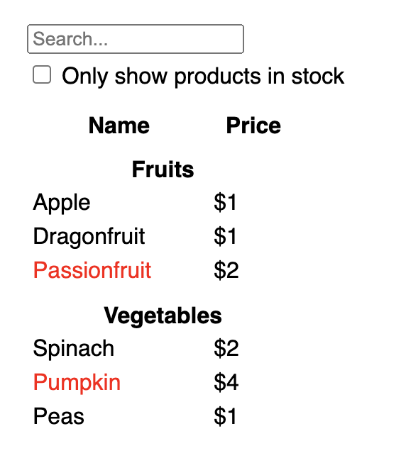 你可以查看你应用程序的表现。在下面的沙盒代码中,通过修改 useState('')useState('fruit') 以编辑 filterText 的初始值,你将会发现搜索输入框和表格发生更新: